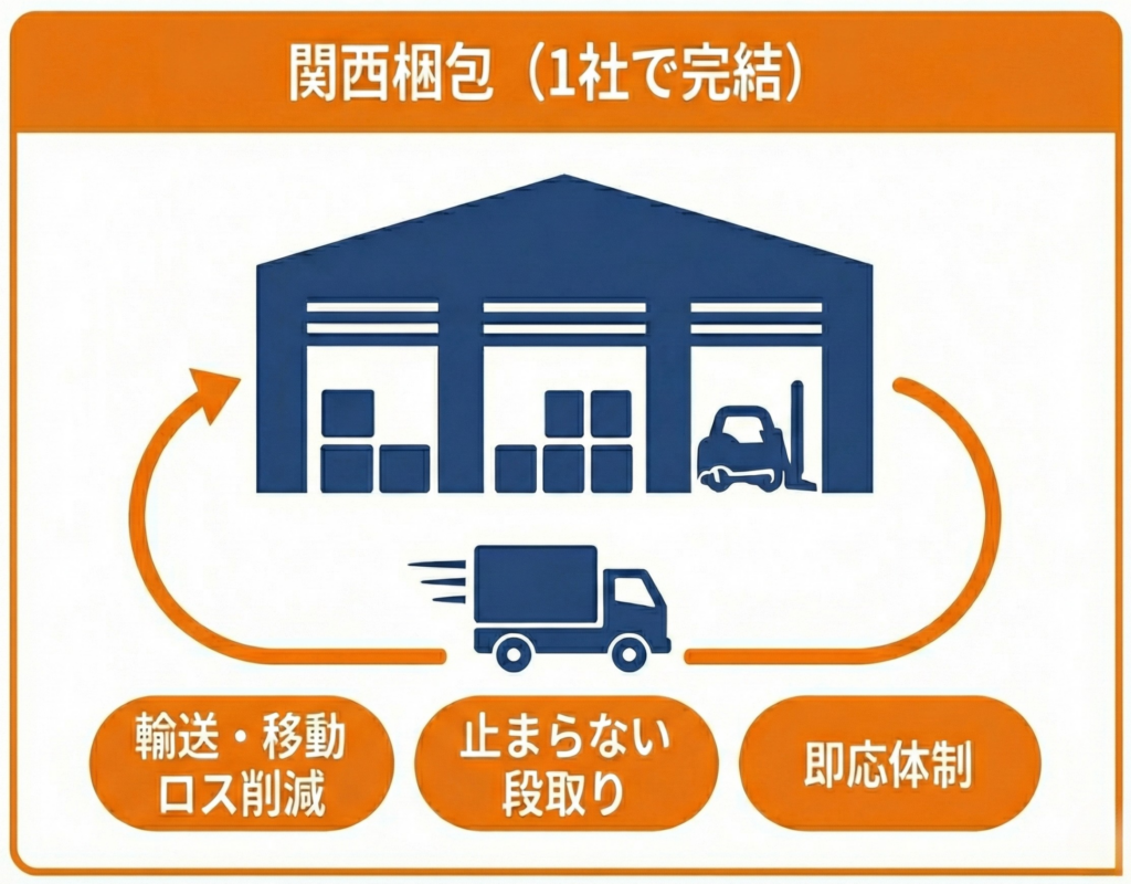 輸送時間を減らしたいという緊急要請に対し、関西梱包は受託業務の範囲内で必要工程のみを、お客様施設内の指定エリアで実施。