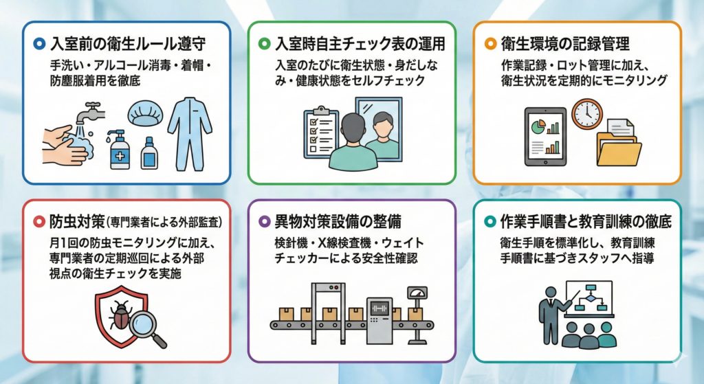 また、作業記録やロット管理とあわせて衛生環境の記録・管理を行い、衛生状態を定期的にモニタリングしています。加えて、専門業者による定期巡回と防虫監査を実施し、外部視点を取り入れた管理体制を構築しています。