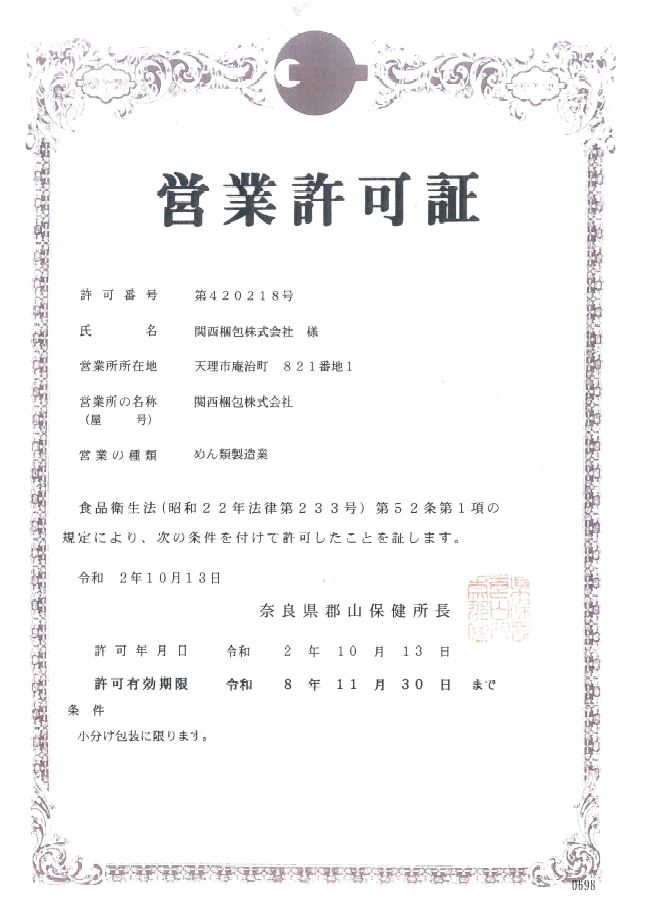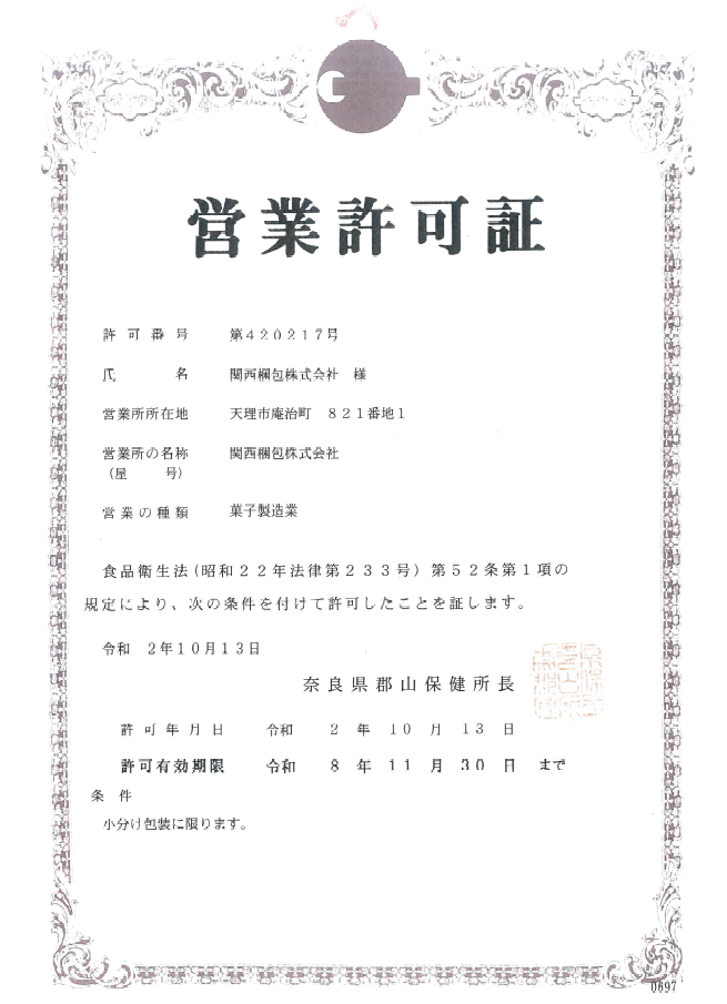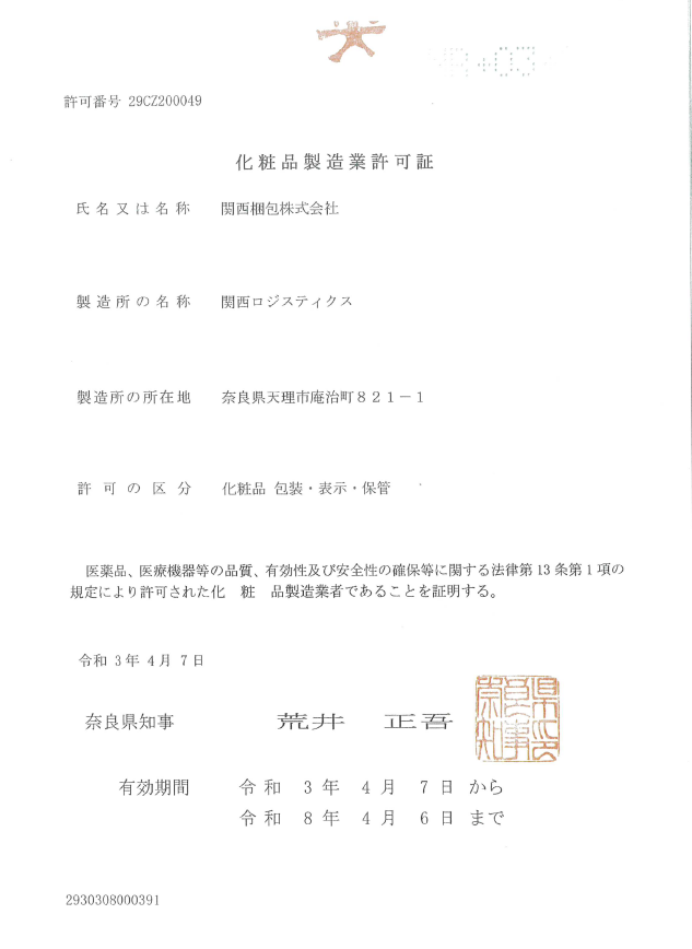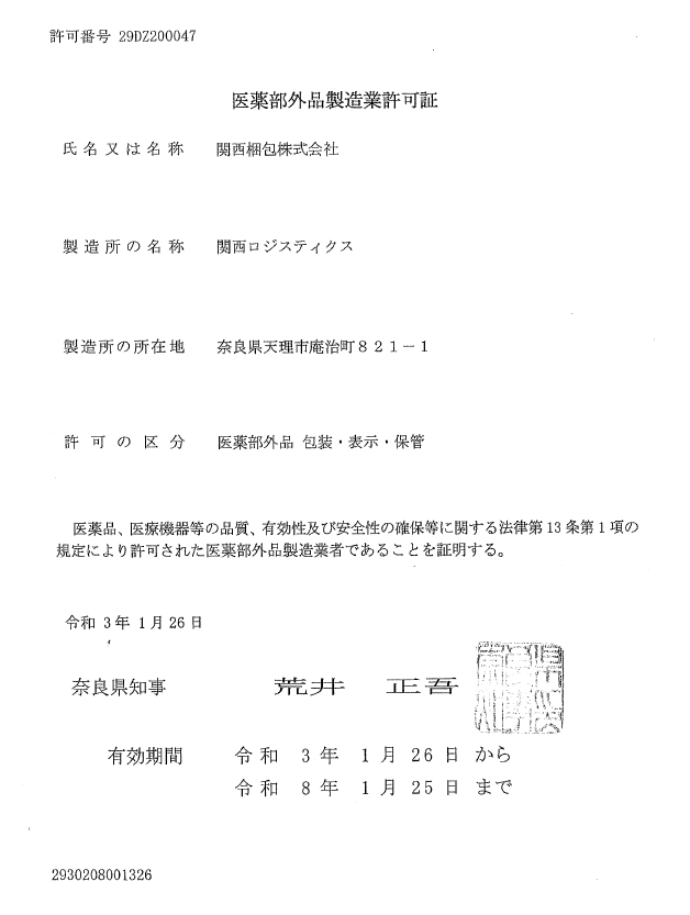 本社工場と関西ロジスティクス加工所(SPAKL)の2拠点で、以下の製造・包装許可を取得しています。